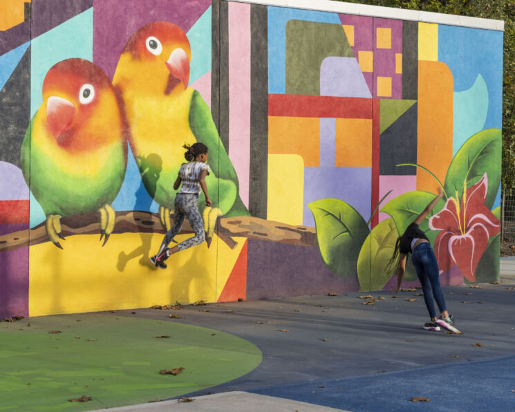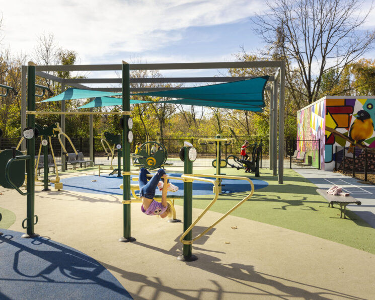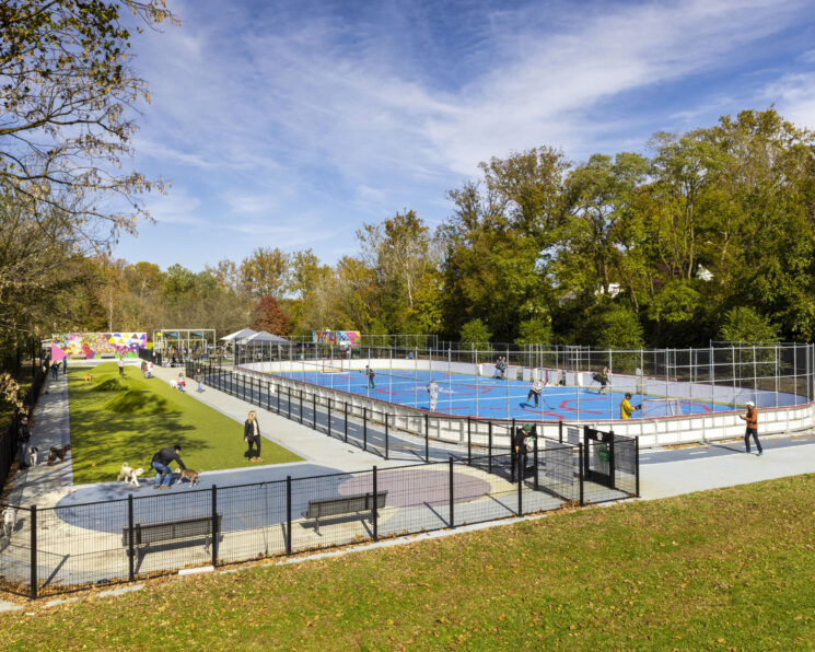 JHLA led an interdisciplinary renovation of Dewey Local Park in Wheaton, MD, transforming existing tennis and basketball courts atop a 20' stormwater vault into a vibrant, multi-generational destination. New amenities across the 36,000 SF roof deck include a dog park, adult fitness area, two shade structures, and a regulation street hockey/futsal court donated by the Washington Capitals — all requiring careful detailing to protect the underlying slab.