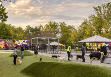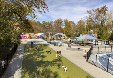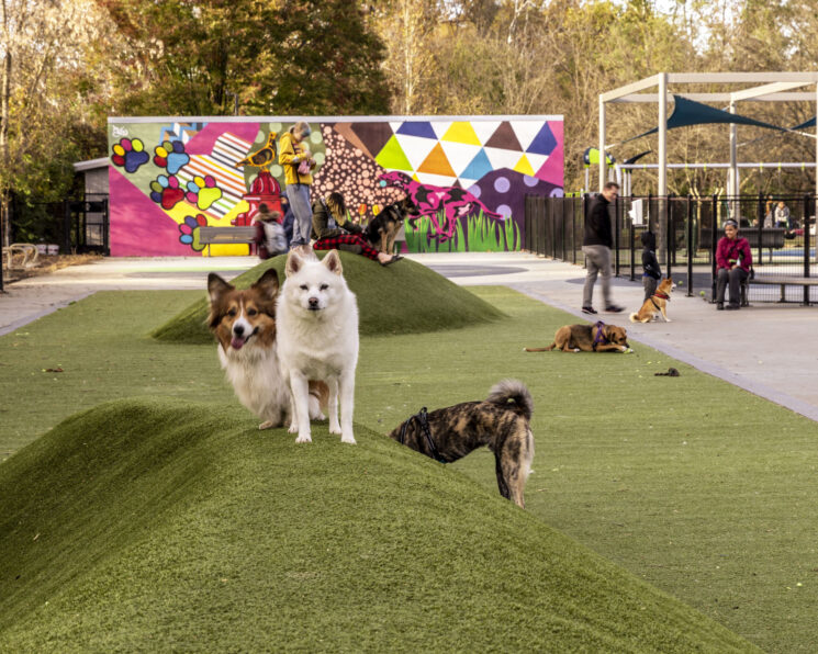 The 19,000 SF dog park features synthetic turf mounds over a lightweight stalite gravel base, with shade structures engineered to engage the concrete beam structure below. The renovated playground leverages natural topography with a hill slide, rope/bridge circuit, and a connected trail linking to an age-appropriate play area for younger children. A picnic pavilion, dynamic court graphics, mini track, site furnishings, and lighting complete the design.
